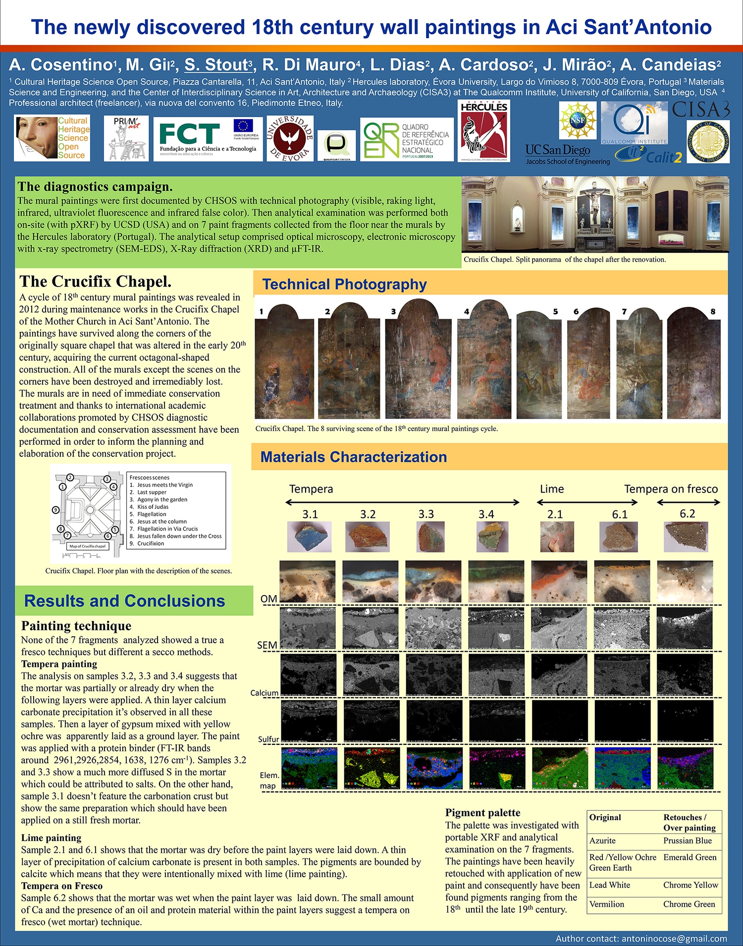 The mural paintings were first documented by CHSOS with technical photography (visible, raking light, infrared, ultraviolet fluorescence and infrared false color). Then analytical examination was performed both on-site (with pXRF) by UCSD (USA) and on 7 paint fragments collected from the floor near the murals by the Hercules laboratory (Portugal). The analytical setup comprised optical microscopy, electronic microscopy with x-ray spectrometry (SEM-EDS), X-Ray diffraction (XRD) and µFT-IR.