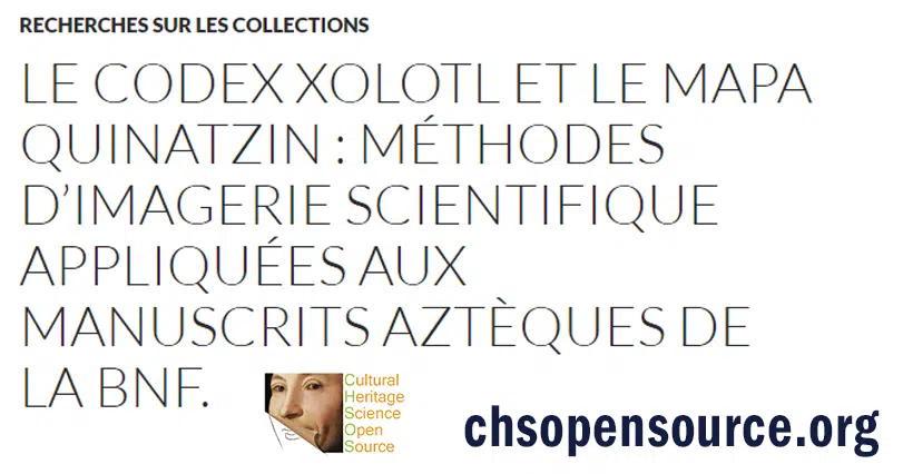 Le CHSOS (Cultural Heritage Science Open Source) a récemment été sollicité pour appliquer des méthodes d’imagerie scientifiquepour documenter le Codex Xolotl (Mexicain 1-10) et le Mapa Quinatzin (Mexicain 11-12) conservés au département des Manuscrits de la Bibliothèque nationale de France. Ces deux documents sont approximativement datés de l’an 1540. Tous les deux sont rédigés en nahuatl, langue aztèque, mais rédigés en écriture européenne. Ils portent également des corrections en écriture indigène non-alphabétique que les technologies de la photographie permettent de rendre lisible. …. …..