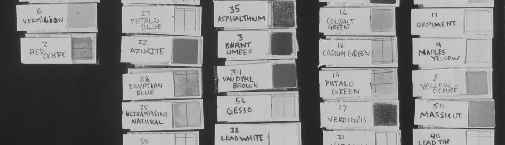 Historical Pigments swatches. Visible (normal ) photography. Historical Pigments swatches. Ultraviolet Fluorescence photography. Zinc white on the bottom exhibits its characteristic yellow UV fluorescence. Historical Pigments swatches. Ultraviolet Reflected photography. Titanium white and zinc white – modern whites – are immediately distinguished from the historical lead white. Historical Pigments swatches. Infrared photography. Most of the pigments become transparent. Historical Pigments swatches. Infrared Reflectography with InGaAs camera (900-1600 nm). More pigments become transparent at longer wavelengths.