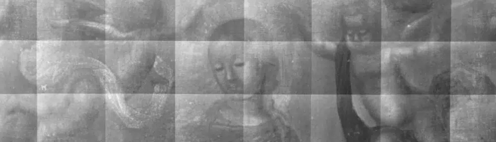 Infrared Reflectography mosaicing of 104 InGaAs images. Gigapan makes the shooting process precise and fast while PTGUI takes care of stitching the images.Panoramic Infrared reflectography is the low cost alternative to high resolution infrared reflectography done with pretty costly systems. I plugged my InGaAs camera (320×256 pixels) Merlin NIR produced by Indigo Systems to a Gigapan Pro head to produce the Infrared Reflectography image hosted on gigapan.com and on IIPIMAGE. A total of 104 images were shot with a 200 mm telephoto lens and stitched with PTGUI software.