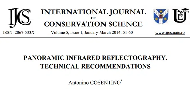 “Panoramic Infrared Reflectography. Technical Recommendations” has been published on the International Journal of Conservation Science, IJCS Volume 5, Issue 1, January-March 2014: 51-60. In this paper I provide more detailed information on the new technique of doing infrared reflectography with a panoramic system. I have been posting on this idea from a while on the blog. This is the method I teach on my training programs and I use myself for art examination.