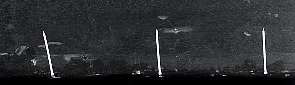 The radiograph displays a crack of the right border of the panel fixed in place with three modern nails. Two metal fragments of presumably old and soft nails, with an arrow shape, are also evident on the left side, toward the center. The two main knots evident on the back show up on the radiograph.