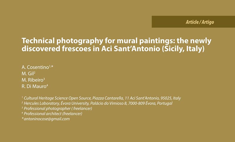Febbraio 2015 – A. Cosentino, M. Gil, M. Ribeiro, R. Di Mauro “Technical Photography for mural paintings: the newly discovered frescoes in Aci Sant’Antonio (Sicily, Italy)” Conservar Património 20, 23-33, 2014.